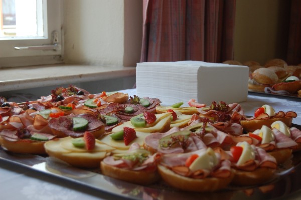 Sie planen ein Fest? Wir haben den Partyservice! Egal ob kleine Familienfeier, gehobenes Geschäftsessen, Polterabende, Geburtstage, Dorffeste oder Buffets, wir beliefern Sie gerne! Wochentags, am Wochenende sowie an Sonn- und Feiertagen. Zuverlässig erledigen wir für Sie alles rund ums Essen und die Bewirtung, dazu zählt auch sofern Sie es wünschen: die Ausgabe der Speisen, Geschirr sowie das Abspülen des benutzen Geschirrs, Bierzeltgarnituren für ca 140 Personen, Sonnenschirme etc. Werfen Sie einen Blick in unsere Gerichte-Liste, sie bietet Ihnen einen Auszug unserer Leistungen. Sollte Ihnen etwas fehlen, so fragen Sie einfach nach und lassen sich von uns ausführlich beraten. Partyservicegerichte: | Suppen und Vorspeisen: | | | | | | | Ungarische Gulaschsuppe, Fränkische Kartoffelsuppe, Tomatencremesuppe, Leberknödelsuppe, | | geräuchertes Forellenfilet mit Sahnemeerrettich, Krabbencocktail, Räucherlachsschnitten | | | | | | | | | | Bratengerichte: | | | | | | | Gegrillter Schweinebauch, Backschinken, Zwiebelbraten, Paprikabraten, Jägerbraten, | | Griechischer Braten, Hubertusbraten, gegrillter Schweinekamm, Zigeunerrollbraten, Rippchen, | | Knöchle, Schäufele, , Schweinebraten, Kalbsbraten, gem. Braten, Kalbshaxnfleisch, Kalbshaxn | | Fleischküchle, Schaschlik, Schaschlikpfanne, Schnitzel paniert, Campignonschnitzel, | | Lendenspieße "Zigeuner Art", Lendchen in Champignonsoße, Zigeunerschnitzel, Cordon bleu, | | Schlemmersteaks, Schweinerückensteaks gefüllt, Schinkenröllchen gebacken, Spanferkel, | | Lasagne mit Gemüse, Schlemmersteaks, Lammbraten, Lammkotelett, Pefferhaxe oder Schäuferle | | | | | | | | | | Blätterteig- und Brotteiggerichte: | | | | | | Lende im Blätterteig, Bratwürste im Blätterteig, Metzgerzöpfe, Schlemmerschnitten, | | Schinken und Kassler im Brotteig, Putenbrust im Blätterteig (neu) | | | | | | | | | | | | Geflügelgerichte: | | | | | | | Hähnchenschlegel, Putenschnitzel paniert, Reispfanne "Asia" (Putenfleisch mit Paprika und | | Curryreis), Putenschnitzel "Hawai", Gänsebrust, Gänsekeulen | | | | | | | | | | | | Fischgerichte: | | | | | | | | Fischfilet in Dillrahmsoße, Seelachsfilet gebacken, Tomatenfisch überbacken | | | | | | | | | | | Warme Würste: | | | | | | | Bratwürste, Wiener, Weißwürste, Bockwürste, Currywürste, Leberkäse | | | | | | | | | | | Kalte Speisen und Snacks: | | | | | | Bratenplatten, Aufschnittplatten, Käseplatten, Schinkenplatten, rustikale Platten, Fischplatten, | | garnierte Weißbrothappen, belegte Brote oder Brötchen, Sandwiches, Pizzabrötchen, Pizza | | | | | | | | | | Beilagen und Salate: | | | | | | | Klöße, Rösti, Kroketten, Pommes, Kartoffelsalat, Reis, Gemüsereis, Mischgemüse, Kraut | | Nudeln, Bratkartoffel, | | | | | | | Grüner Salat, Gurkensalat, Krautsalat, Tomatensalat, Hirtensalat, Wurstsalat, Fleischsalat, | | Nudelsalat, Eiersalat, Dillhappen (Fischssalat), Tzaziki, Tomaten mit Mozarella, Obatzter-Käse, | | Stadtwurst mit Musik | | | | | | | | | | | | | | | Vegetarische Gerichte: | | | | | | | Gemüsetaler, Nudelpfanne, Gemüsepizza | | | | | | | | | | | | | | | | | | | | | Desserts: | | | | | | | | Obstsalat mit frischen Früchten, verschiedene Puddings mit Fruchtcocktail, Quark mit Früchten, | | verschiedene Cremes (bayrisch Creme, Weinschaumcreme), Mousse au Chocolat, Rote | | Grütze, Sauerkirschen mit Sahne | | | | | | | | | | | | | | Fingerfood: | | | | | | | | | | | | | | | | Schnitzelspieße, Hackbällchen garniert mit Gemüse, Schinkenröllchen mit Ananas, | | kleine Bratwürste im Blätterteig, Lendenspieße "Zigeuner Art", Mozzarellaspießchen. |
